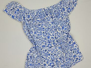 Bluzka damska z odkrytymi ramionami (hiszpanka) w biało‑niebieski, kwiatowy wzór. - Rozmiar: L (etykieta: WOMEN L) - Krój: luźny, z elastyczną gumką wokół dekoltu/ramion; krótkie, delikatnie falow...