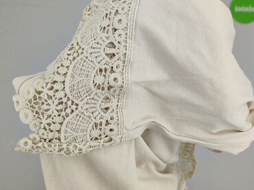 Biała damska bluzka z koronką przy dekolcie - Fason: lekko luźna, z delikatnie marszczonym dołem - Rękaw: 3/4 - Dekolt: okrągły, z efektowną, ażurową wstawką koronkową z przodu - Materiał: cienka,...