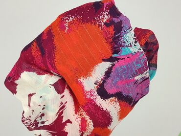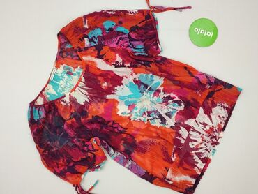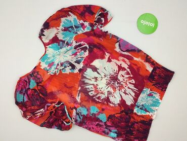 Bluzka damska BEL&BO, rozmiar M. - Kolorystyka: fiolet, pomarańcz, biel; wzór kwiatowo-abstrakcyjny w stylu retro. - Krój: dekolt w serek, lekko dopasowana talia. Krótkie, szerokie, transparentne ...