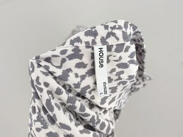 Bluzka damska HOUSE, rozmiar L. - Fason: lekko luźny, z dekoltem w serek i zapięciem na kilka guzików z przodu - Rękawy: długie, marszczone, mankiety zapinane na guziki - Dół: zaokrąglony - Wzór: ...