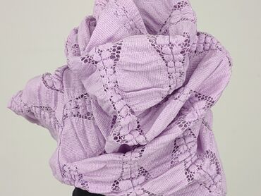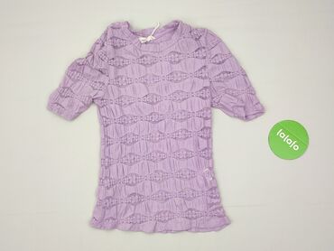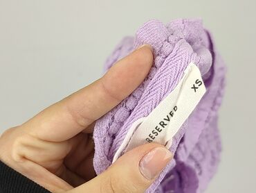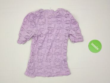 Liliowa bluzka damska Reserved w rozmiarze XS. Bluzka ma krótkie rękawy i okrągły dekolt. Wykonana z materiału z ażurowym wzorem. Idealna na co dzień.