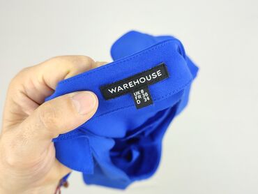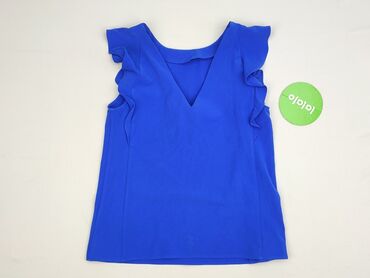 Bez rękawówUżywana, ale w idealnym stanie bluzka damska marki Warehouse. Rozmiar z metki to UK 8, FR 36, D 34. Bluzka jest w kolorze niebieskim i ma falbanki przy rękawach. Wykonana z materiałów: 91% poliester, 9% elastan.