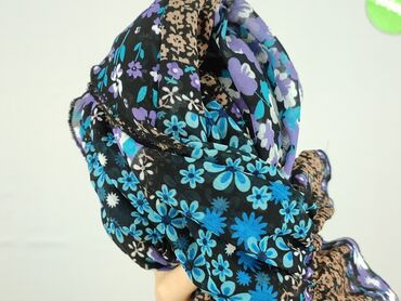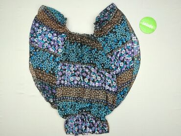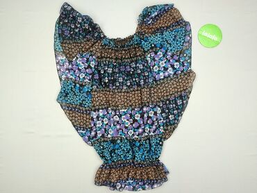 Bez rękawówUżywana bluzka damska w idealnym stanie. Bluzka ma elastyczny dekolt typu hiszpanka, który można nosić na ramionach lub opuścić. Wzór w kwiaty w odcieniach niebieskiego, fioletu i brązu. Idealna na lato.