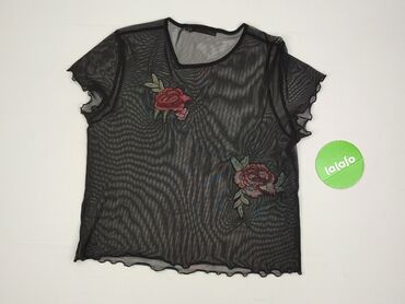 Czarna ażurowa bluzka damska z krótkim rękawem - Fason: dopasowany, elastyczna dzianina - Dekolt: okrągły, ozdobiony satynową wstążką przewlekaną wzdłuż krawędzi oraz aplikacją-kwiatem z tej samej...