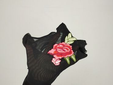 Krótki rękawCzarna, ażurowa bluzka damska z krótkim rękawem, ozdobiona haftowanymi aplikacjami w kształcie czerwonych róż. Bluzka charakteryzuje się okrągłym dekoltem i falbankami na rękawach oraz u dołu, co nadaje jej lekkości. Idealna jako element stylizacji na lato lub jako narzutka na strój kąpielowy.