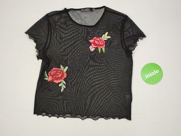 Damska bluzka w kwiaty - Krój: dopasowany, z krótkim rękawem i okrągłym dekoltem - Wzór: drobne, wielobarwne kwiaty na czarnym tle; przy dole podwójny pas z kwiatowym borderem - Długość: do bioder...