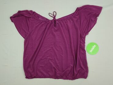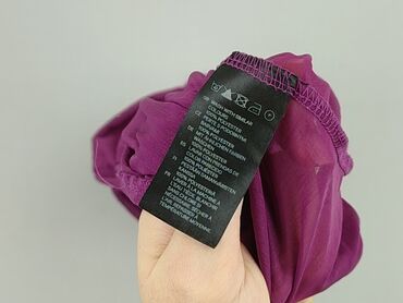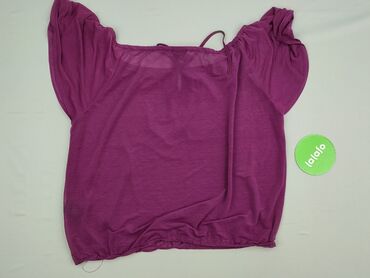 Krótki rękawFioletowa bluzka marki H&M, wykonana w 100% z poliestru, idealna na letnie dni. Posiada elastyczny dekolt z wiązaniem, który można nosić na ramionach lub zsuwać z ramion, oraz krótkie, szerokie rękawy. Dół bluzki jest również elastyczny, co zapewnia swobodne dopasowanie. Lekki i przewiewny materiał gwarantuje komfort noszenia.