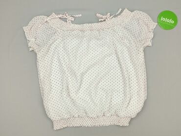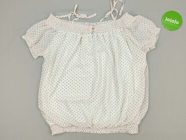 Krótki rękawBiała bluzka damska z krótkim rękawem, ozdobiona czerwonymi kropkami. Bluzka ma marszczony dekolt typu hiszpanka oraz marszczony dół, co nadaje jej luźny i wygodny fason. Na ramionach znajdują się wiązane ramiączka, które dodają uroku i umożliwiają regulację. Idealna do letnich stylizacji, zapewnia swobodę ruchów i komfort noszenia.
