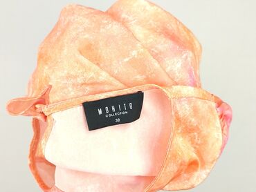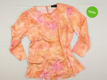 Długi rękawBluzka damska marki MOHITO COLLECTION w rozmiarze 38, wykonana w 100% z poliestru. Charakteryzuje się okrągłym dekoltem i długimi rękawami z rozszerzanymi mankietami, dodającymi elegancji. Wzór tie-dye w odcieniach pomarańczowego i różowego nadaje jej unikalny, artystyczny wygląd. Jest to idealny wybór do stylizacji codziennych, jak i na specjalne okazje, dodając lekkości i koloru każdej garderobie.