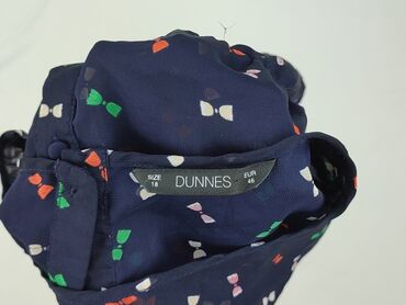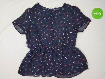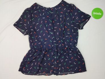 Bluzka damska z lekkiej, zwiewnej tkaniny w drobny, roślinny wzór. Kolorystyka: odcienie granatu, błękitu, ecru z akcentami różu i zieleni. - Fason luźny, komfortowy - Dekolt w kształcie litery V...Stan: