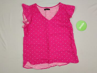 Bluzka damska Sinsay, rozmiar M. - Kolor: pudrowy róż - Krój: swobodny, lekko przedłużany - Rękawy: krótkie z falbanką - Dekolt: w kształcie litery V z ozdobnym wycięciem i lamówką - Zapięcie: guz...