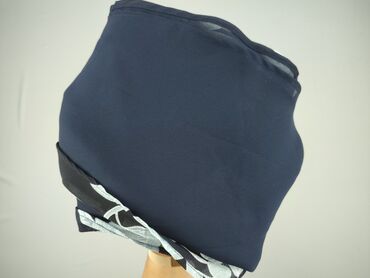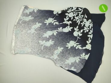 Sukienka damska z krótkim rękawem, w czarno‑niebieski wzór przypominający koronkę. - Fason: prosta, lekko dopasowana, zakończona nieregularnym, marszczonym dołem - Dekolt: łódka, szeroka czarna pl...