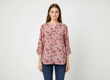 Rękaw 3/4Różowa bluzka damska marki Beloved Woman z długimi rękawami, ozdobiona wzorem w motyle i paisley. Posiada okrągły dekolt i zapięcie na guziki, co dodaje jej elegancji. Bluzka idealnie sprawdzi się na co dzień, jak i na specjalne okazje, zapewniając komfort noszenia dzięki lekkiemu materiałowi. Dół bluzki zaokrąglony.