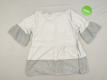 Biała bluzka damska w granatowe kropki (polka dot). - Krój: lekko wydłużony tył, zaokrąglony dół. - Rękaw: krótki, z możliwością podwinięcia i zapięcia na guzik. - Dekolt: stójka/okrągły, rozpinany...