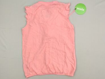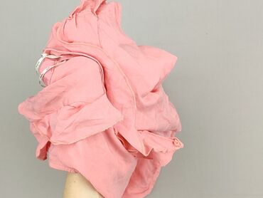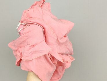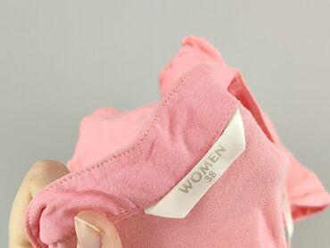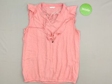 Bez rękawówRóżowa bluzka damska w rozmiarze 38, z dekoltem w kształcie litery V, ozdobiona falbankami i wiązaniem z przodu. Krótkie rękawy z falbankami dodają lekkości i swobody. Dół bluzki zakończony jest ściągaczem. Idealna na co dzień i letnie stylizacje, zapewniająca wygodę i swobodę ruchów.