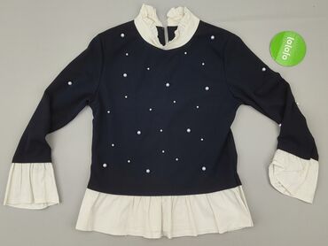 Długi rękawBluzka damska w kolorze granatowym z długimi rękawami, ozdobiona perłowymi aplikacjami na przodzie i rękawach. Posiada biały, marszczony kołnierz typu stójka oraz szerokie, marszczone mankiety. Dół bluzki również wykończony jest białym, marszczonym pasem, imitującym warstwę. Zapięcie na plecach ułatwia zakładanie. Idealna do stylizacji eleganckich i casualowych.
