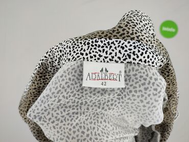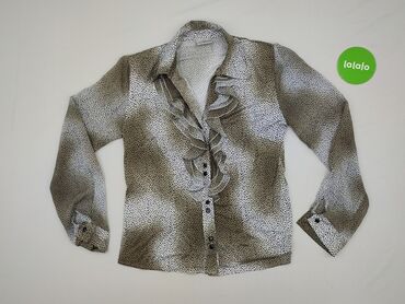 Długi rękawTa damska bluzka w rozmiarze 42, marki Adalbert, charakteryzuje się wzorem w drobne cętki. Wyposażona jest w długie rękawy zakończone mankietami zapinanymi na guziki oraz ozdobne falbany z przodu, dodające elegancji. Kołnierzyk i zapięcie na guziki dopełniają klasyczny wygląd, sprawiając, że bluzka nadaje się zarówno do codziennych, jak i bardziej formalnych stylizacji.