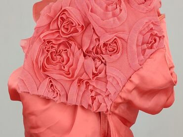 Krótki rękawElegancka bluzka damska w odcieniu koralowym, wykonana z poliestru, co zapewnia jej gładką, lekko połyskującą fakturę. Charakteryzuje się krótkimi, bufiastymi rękawami ozdobionymi aplikacjami w kształcie róż, dodającymi jej unikalnego charakteru. Okrągły dekolt i marszczenia z przodu nadają bluzce swobodny, a jednocześnie elegancki wygląd. Idealna propozycja do stylizacji zarówno codziennych, jak i na specjalne okazje. Jest to rozmiar 10 (UK), co odpowiada rozmiarowi M.