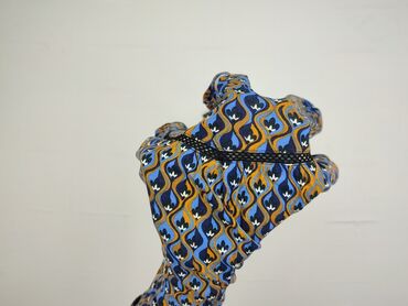 Długi rękawBluzka damska marki Reserved w rozmiarze L, wykonana w 100% z wiskozy. Charakteryzuje się okrągłym dekoltem z wycięciem na plecach zapinanym na guzik oraz długimi rękawami zakończonymi delikatnymi falbankami. Górna część bluzki ozdobiona jest czarną, ażurową wstawką. Wzór obejmuje stylizowane liście lub krople w odcieniach niebieskiego, brązu i czerni na jasnym tle. Model ten jest wszechstronny, idealny do codziennych stylizacji.