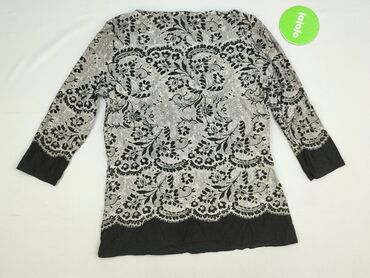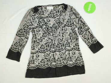 Bluzka damska Per Una (Marks & Spencer) - Kolor: czarny - Rozmiar z metki: 12 (UK) - Krój: dopasowany, z modelującymi przeszyciami - Dekolt: w kształcie litery V z ozdobnym marszczeniem na biuście ...Elegancka bluzka damska marki Per Una, wykonana z mieszanki wiskozy i elastanu, co zapewnia komfort noszenia i dopasowanie do sylwetki. Bluzka charakteryzuje się czarno-szarym wzorem inspirowanym koronką, który dodaje jej wyrafinowanego wyglądu. Dekolt w kształcie litery V z wiązaniem podkreśla szyję, a ściągany pas w talii pozwala na regulację dopasowania. Rękawy o długości 3/4 zakończone są szerokimi mankietami, a dół bluzki zdobi falbanka. Idealna zarówno do codziennych stylizacji, jak i na bardziej formalne okazje.