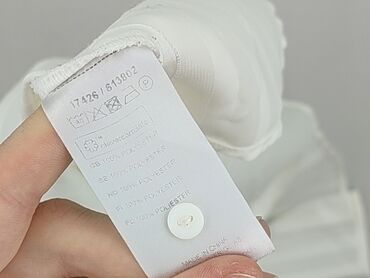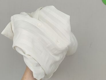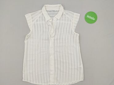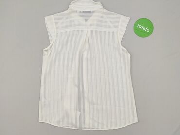 Bez rękawówBiała bluzka damska z krótkim rękawem, marki KappAhl. Bluzka wykonana jest z poliestru, co zapewnia jej lekkość i przewiewność. Posiada kołnierzyk i zapięcie na guziki, a także pionowe, transparentne paski, które dodają jej elegancji. Bluzka będzie idealnym wyborem na lato, do noszenia na co dzień lub na bardziej formalne okazje. Jest to uniwersalny element garderoby, który łatwo dopasować do różnych stylizacji.