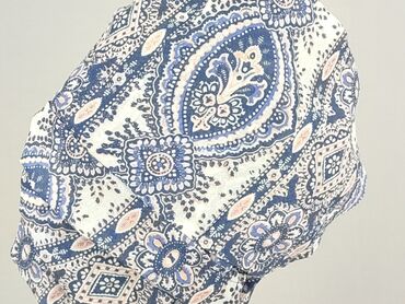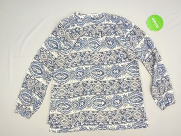Długi rękawDamska bluzka z długimi rękawami, ozdobiona wzorem paisley w odcieniach bieli, błękitu i szarości. Charakteryzuje się dekoltem w kształcie litery V z wiązaniem na sznurek, zakończonym frędzlami. Wykonana z lekkiego materiału, idealna do noszenia na co dzień.