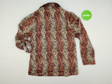 Bluzka damska z długim rękawem, ozdobiona różnorodnymi wzorami zwierzęcymi, takimi jak panterka, w odcieniach brązu, beżu i czerni. Bluzka ma kołnierzyk ze stójką i dekolt w kształcie litery V zapi...