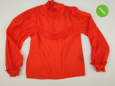 Długi rękawCzerwona bluzka marki H&M z długimi, bufiastymi rękawami zakończonymi falbankami. Bluzka ma wysoki kołnierz typu stójka oraz ozdobne falbany na dekolcie, nadające jej eleganckiego wyglądu. Wykonana w 100% z poliestru, co zapewnia jej lekkość i przewiewność. Idealna na różne okazje, od casualowych spotkań po bardziej formalne wyjścia. Bluzka w rozmiarze europejskim 36.