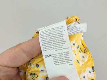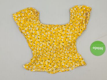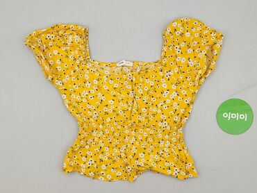 Bluzka Sinsay XS – żółta, w kwiaty - Krój: krótka, z dekoltem kwadratowym/lekko hiszpańskim - Rękawy: długie, bufiaste, zakończone ściągaczem i troczkami do wiązania - Tył: elastyczny panel ze smo...