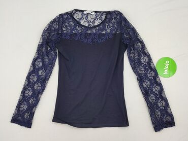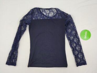 Koronkowa bluzka damska, granatowa - Fason: dopasowany, z długim prześwitującym rękawem - Materiał: delikatna koronka z kwiatowym wzorem; elastyczna dzianina/siateczka pod spodem na korpusie (ręka...