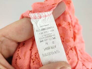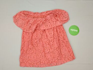 Bez rękawówKoronkowa bluzka damska w kolorze koralowym, z hiszpańskim dekoltem i falbaną. Wykonana w 100% z poliestru, co zapewnia trwałość i łatwość w pielęgnacji. Idealna na ciepłe dni i swobodne stylizacje.