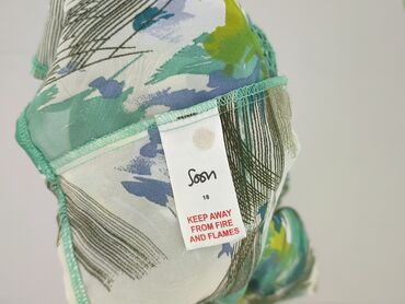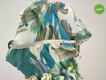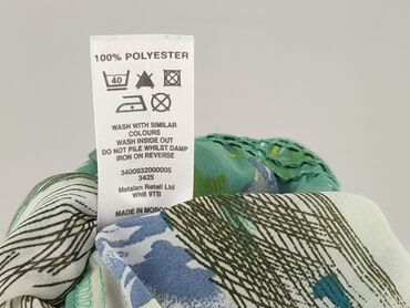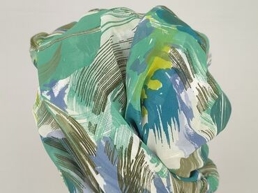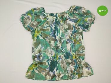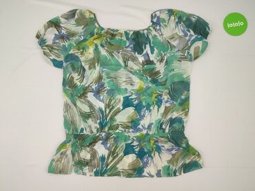 Bluzka damska z krótkim rękawem, wykonana w 100% z poliestru, co zapewnia jej lekkość i przewiewność. Charakteryzuje się wzorem z motywami roślinnymi i nieregularnymi kształtami w odcieniach zielen...