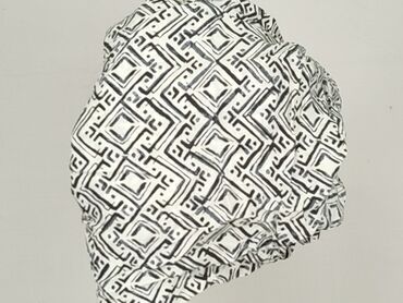 Bez rękawówBluzka damska w kolorze białym z czarnym geometrycznym wzorem. Dekolt typu carmen z elastycznym marszczeniem, który może być noszony opuszczony na ramiona lub podniesiony. Szerokie ramiączka są wiązane, co pozwala na regulację. Luźny krój zapewnia wygodę noszenia. Idealna na letnie dni lub jako element casualowej stylizacji.