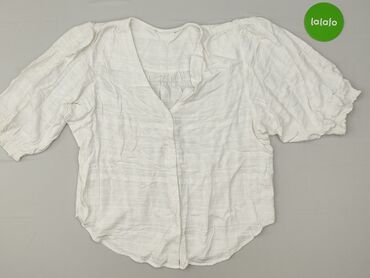 Biała koszula/bluzka damska z krótkim rękawem - Krój: luźny, zapinana na rząd guzików z przodu - Dekolt: w kształcie litery V - Rękaw: krótki, lekko bufowany - Dół: delikatnie wydłużony z tyłu, ma...