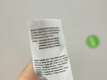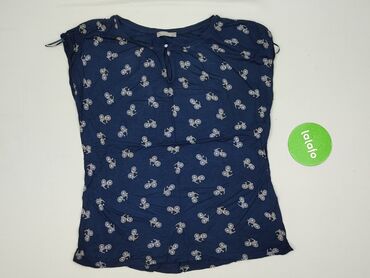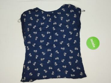 Bluzka damska Orsay z krótkim rękawem - Krój: luźny T‑shirt z dekoltem w serek (V-neck), zaokrąglony dół z przodu i z tyłu - Wzór: gęsty nadruk w drobne kwiaty w kolorach granatowym i żółtym na bi...Stan: