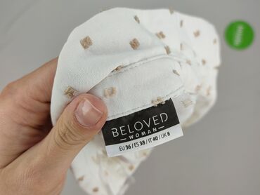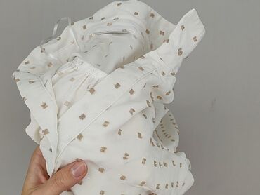 Biała bluzka w czarne grochy - Klasyczny wzór: gęste, równe kropki na białym tle - Delikatnie lejący, satynowy materiał z subtelnym połyskiem - Krótki rękaw typu cap - Okrągły dekolt z drobnymi za...
