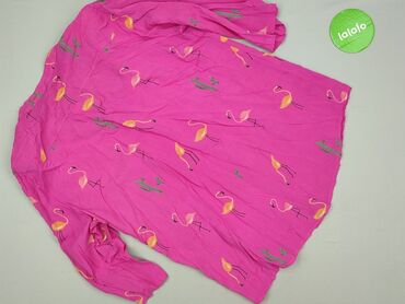 Bladoróżowa koszula/bluzka damska z krótkim rękawem i zapięciem na guziki przy dekolcie. Wzór: kwiaty, gałązki i flamingi w odcieniach różu, niebieskiego, czerni i beżu. Dekolt w kształcie litery V...