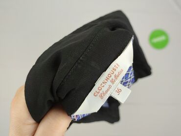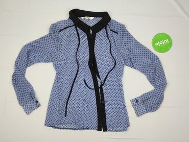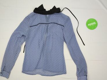 Długi rękawNiebieska bluzka damska marki Clockhouse z długimi rękawami, ozdobiona białym i czarnym wzorem. Charakteryzuje się czarnym kołnierzykiem i czarnymi lamówkami biegnącymi wzdłuż przodu oraz na wysokości ramion z tyłu, co dodaje jej unikalnego wyglądu. Z przodu posiada zapięcie na guziki, a także dwie ozdobne, pionowe falbany. Mankiet zapinany na guziki zapewnia eleganckie wykończenie rękawów. Ta bluzka jest idealna do codziennych stylizacji, a także na bardziej formalne okazje.