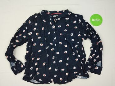 Damska bluzka w odcieniach granatu, wykonana z przezroczystego materiału z wytłoczonym, florystycznym wzorem. Posiada klasyczny kołnierzyk i zapięcie na jasne guziki z przodu. Długie rękawy. Krój s...