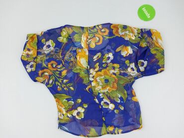 Krótki rękawBluzka damska marki Peckott, w rozmiarze S, o luźnym kroju, idealna na wiosnę i lato. Charakteryzuje się wzorem z żółtymi kwiatami i zielonymi liśćmi na granatowym tle. Wykonana z lekkiego, zwiewnego materiału, który zapewnia komfort noszenia w cieplejsze dni. Krótkie rękawy i zaokrąglony dół dodają jej swobodnego wyglądu, co sprawia, że jest doskonałym wyborem zarówno do codziennych stylizacji, jak i na bardziej okazjonalne wyjścia. Można ją nosić z różnymi dołami, od jeansów po eleganckie spódnice. Przezroczysty materiał sprawia, że bluzka jest przewiewna i dodaje lekkości stylizacji.
