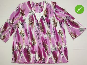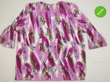 Rękaw 3/4Fioletowa bluzka damska z dekoltem w kształcie litery V, ozdobionym białym panelem i trzema guzikami. Wzór na bluzce przypomina pióra w odcieniach fioletu, brązu i bieli. Rękawy o długości 3/4, rozszerzane ku dołowi, dodają swobody. Luźny fason sprawia, że jest wygodna w noszeniu. Idealna do codziennych stylizacji, zapewnia komfort i lekkość.