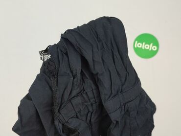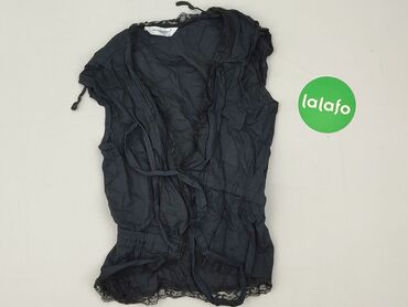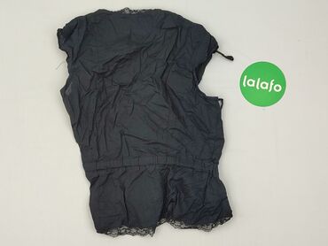 Czarna bluzka damska z krótkim rękawem, wykonana z lekkiego, półprzezroczystego poliestru. Bluzka posiada klasyczny kołnierzyk i wiązanie z przodu, które dodaje jej elegancji. Rękawy są luźne i ozd...Stan: