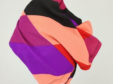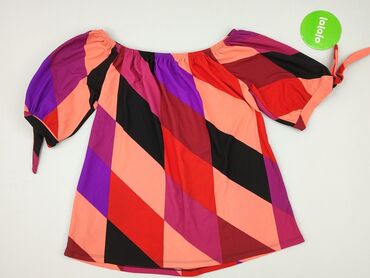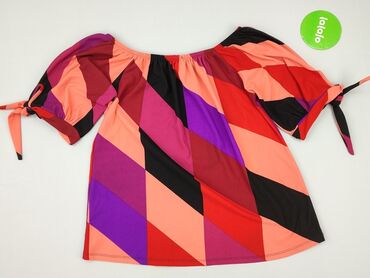 Bluzka damska BEL&BO, rozmiar M. - Kolorystyka: fiolet, pomarańcz, biel; wzór kwiatowo-abstrakcyjny w stylu retro. - Krój: dekolt w serek, lekko dopasowana talia. Krótkie, szerokie, transparentne ...