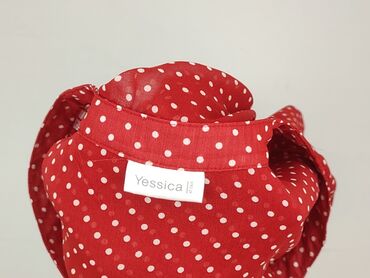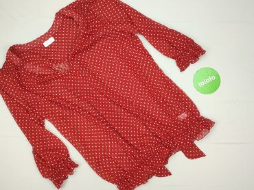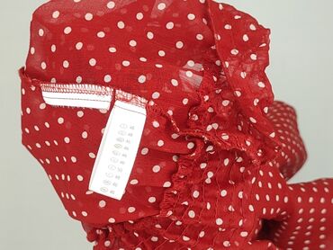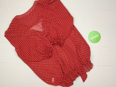 Czerwona bluzka damska z długimi rękawami, ozdobiona subtelnymi kropeczkami na przezroczystej tkaninie. Dekolt okrągły, z małym wycięciem w kształcie łezki, zapinany na guzik z tyłu. Rękawy rozszer...
