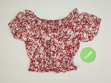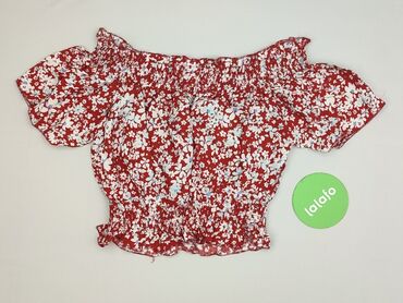 Bluzka damska z krótkim rękawem - Kolor: intensywna czerwień - Wzór: drobne kwiaty na całej powierzchni - Dekolt: szeroki, kwadratowy, z elastyczną gumką (możliwość noszenia na lub lekko poniżej r...Stan: