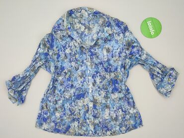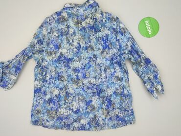 Bluzka damska z lekkiej, zwiewnej tkaniny. - Wzór: patchworkowy z motywami kwiatowymi i geometrycznymi; dominują odcienie niebieskiego, szarości, bieli oraz akcenty różu i żółci. - Krój: luźny, t...