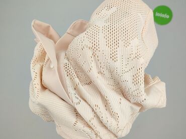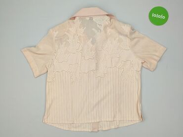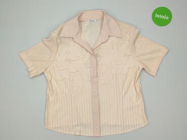 Koszula damska w rozmiarze XL, z krótkimi rękawami, w odcieniach beżu i kremu. Charakteryzuje się unikalnym wzorem geometrycznym w kolorze grafitowym, rozmieszczonym pionowo po obu stronach zapięci...