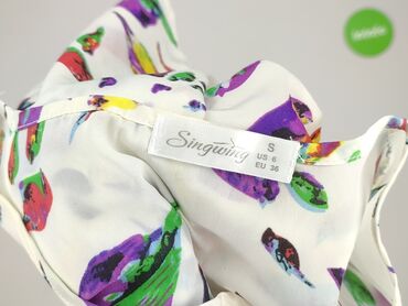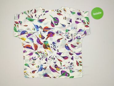 Estetyczna, wyrazista bluzka, która dodaje koloru codziennym stylizacjom. Marka: Singwing. Rozmiar S. Wzór w ptaki w wielu odcieniach fioletu, zieleni, żółci, czerwieni i niebieskiego.