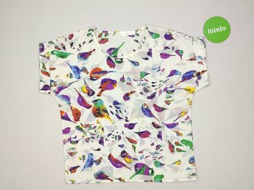 Biała damska bluzka PAUZA z nadrukiem trzech kolorowych ptaszków (kadr w stylu komiksowym na przodzie). - Krój: luźny, z lekko opadającym rękawkiem (nietoperz/kimono), okrągły dekolt. - Materiał: ...