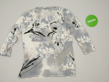 Bluzka damska z długim rękawem, wzór w szare poziome pasy z nadrukiem kwiatowym w odcieniach szarości, granatu i limonkowej zieleni. Okrągły dekolt, elastyczne ściągacze przy dekolcie i u dołu. Mię...